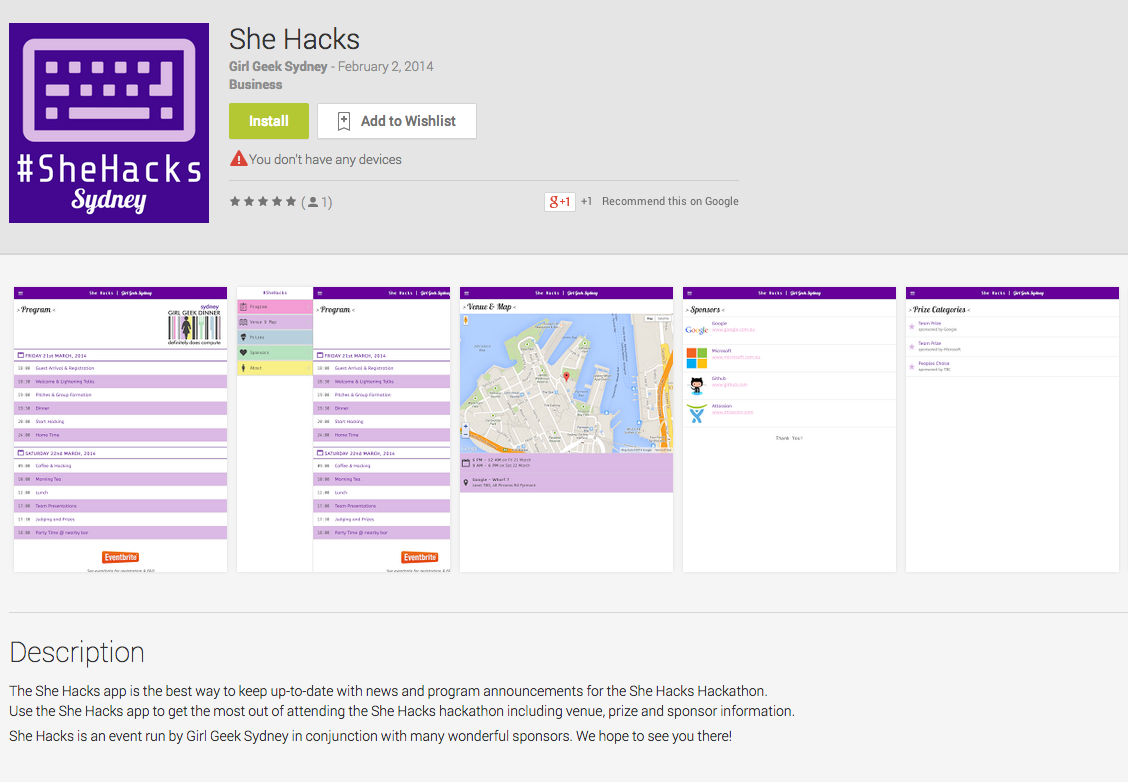 She Hacks app live on the Play Store 02 February 2014 on programming, mobile Hooray, our little app is now live on the Play Store! If you're an Android user, go check it out!